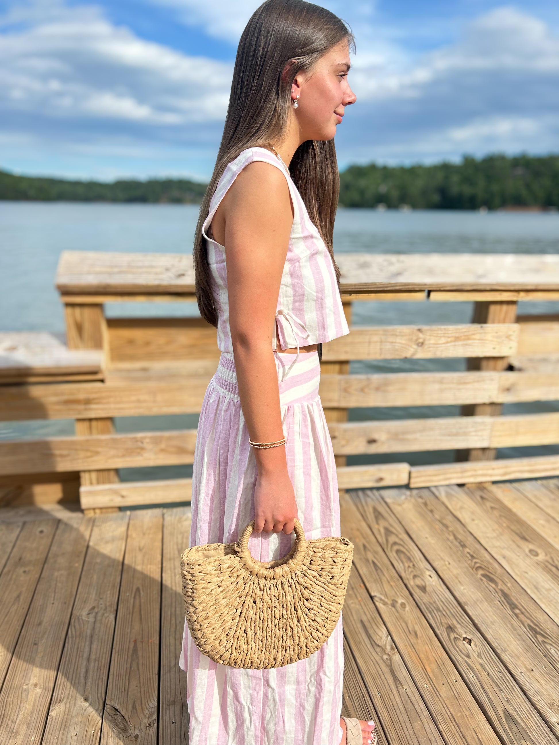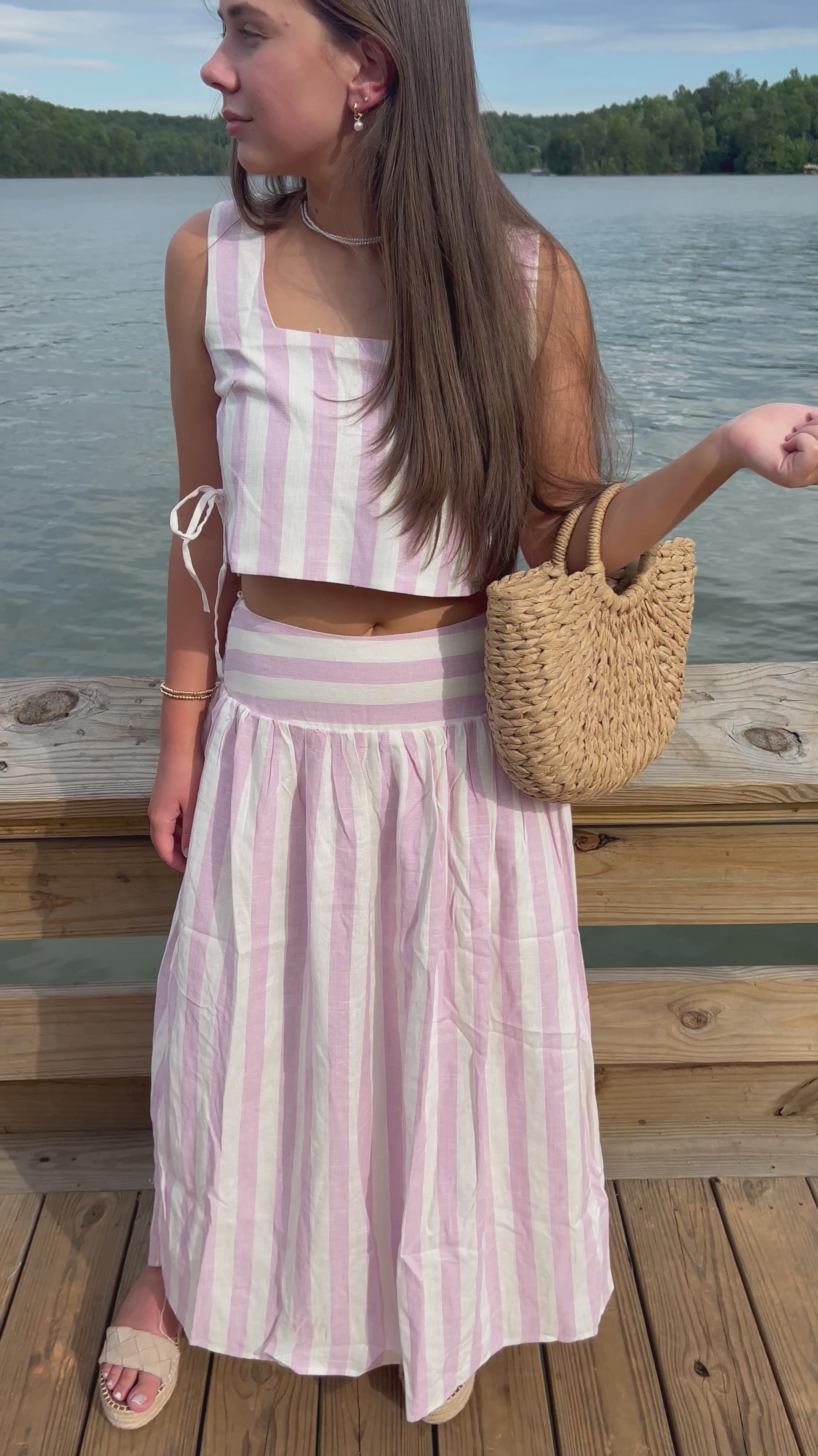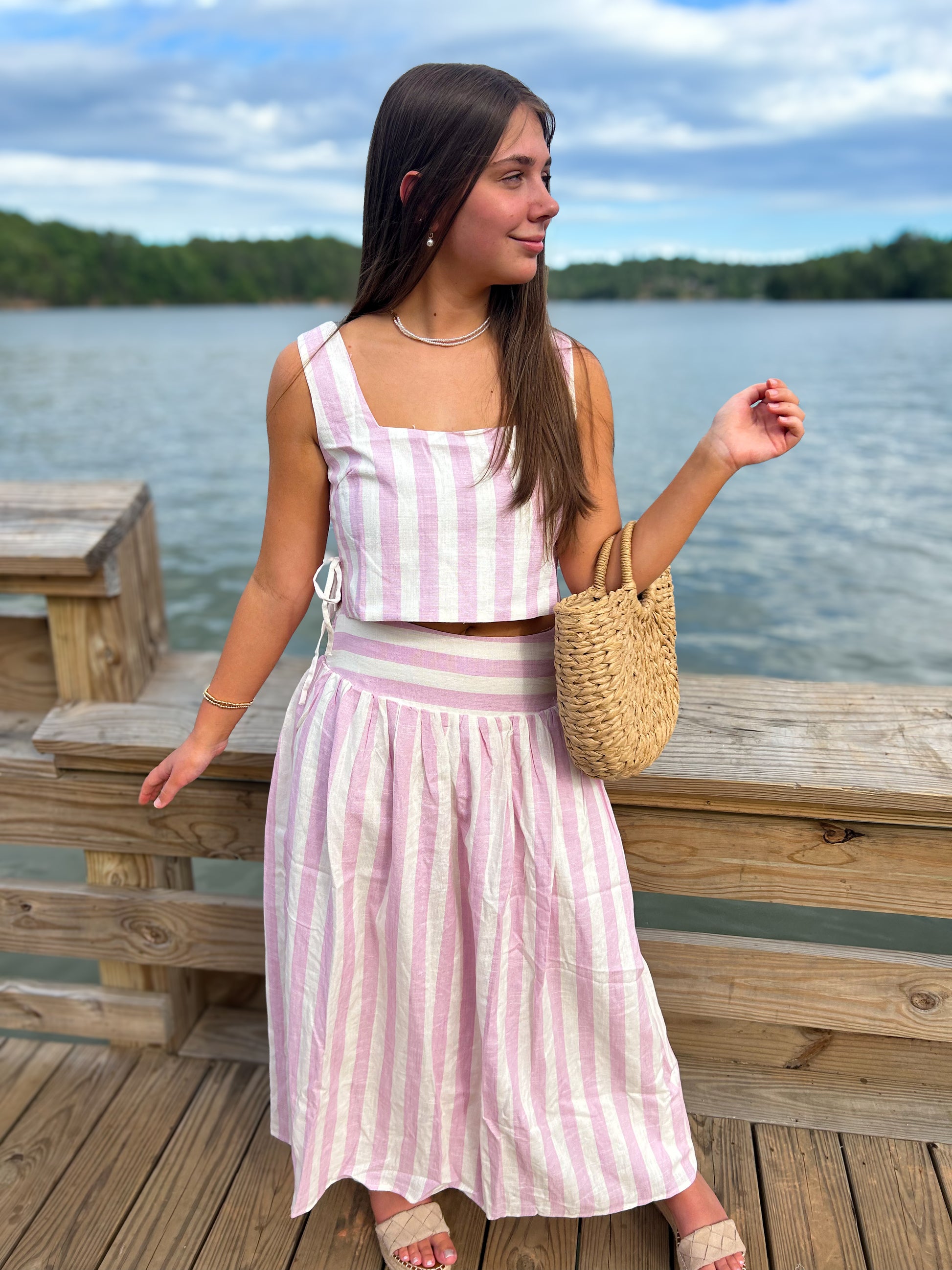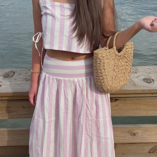 The Daydream Set: your go-to outfit for summertime! With a playful combination of pink and white stripes, this set is designed to make you look absolutely darling. Perfect for those sunny days and fun adventures, this set is a must-have for any fashion-forward individual.